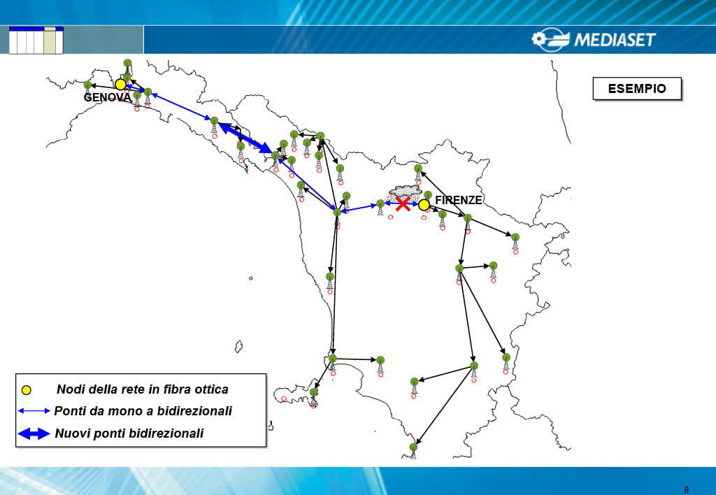 In fase di Realizzazione della Rete x la Distribuzione & Contribuzione in Fibra Ottica M-Tube di Mediaset, al fine di evitare problemi di problemi di feeding nei Ponti Radio SDH in caso di eventi meteo, vennero aggiunte delle tratte BiDirezionali x garantire una ridondanza verso i Siti Trasmissivi, oltre al BackUp Satellitare.