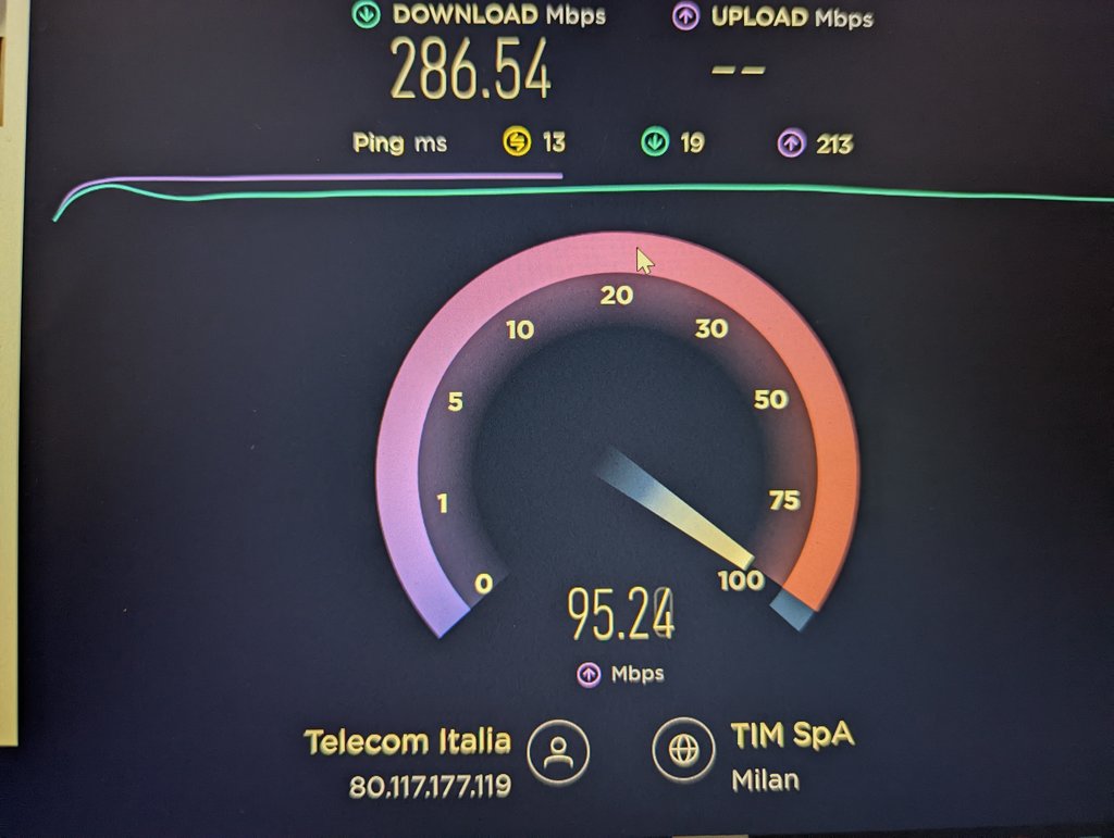 Ho fatto diversi test in questi giorni e succede di tutto: a volte non parte nemmeno lo speedtest (e difatti non ho rete, non si collega Whatsapp, Telegram, etc), altre volte ho 100 mb in più, altre arrivo a 30 mb in down, raramente raggiungo gli 800 mb in down (mentre l'up non sale mai oltre i 95 mb).