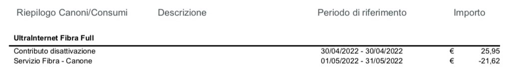 Con Tiscali pagavo 25,95 € al mese. Nonostante avessi già pagato il canone anticipato di aprile e maggio, ho ricevuto da Tiscali un'ultima fattura così composta: