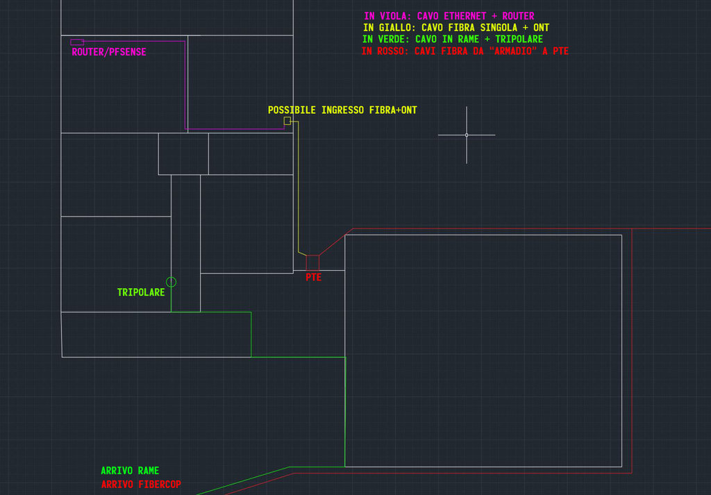 L'immagine sopra rappresenta il mio appartamento come stanze e come è configurato lo stabile, con tanto di percorsi reali di cavi che arrivano, fibra in rosso e rame in verde. Quelli in giallo e viola sono ipotetici.