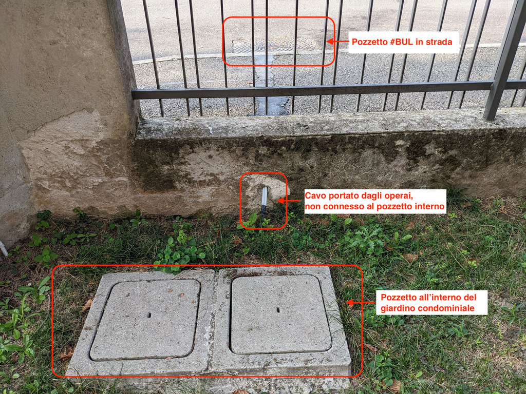 ad aprile un giorno hanno fatto dei lavori sulla strada aggiungendo un tombino di banda ultra larga e portando i cavi verso le case circostanti. Nel caso del mio condominio, hanno bucato il muro di cinta facendo spuntare due tubetti collegati al tombino BUL, più o meno in corrispondenza del pozzetto all'interno del condominio (vedi foto allegata), ma senza collegarli.