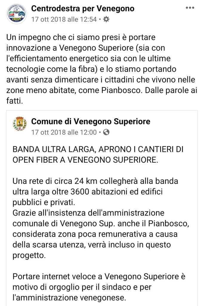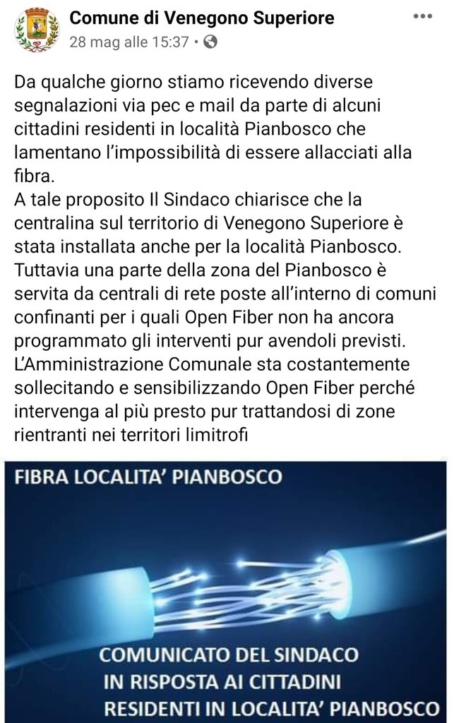 All'inaugurazione dei cantieri a ottobre 2018 probabilmente il field manager di Open Fiber ha assicurato che il progetto per la fibra ottica avrebbe coinvolto anche la località Pianbosco e il comune l'ha comunicato con questo post