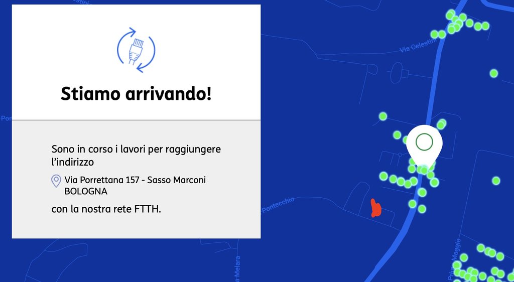 Fabri01 Help! Con gli ultimi aggiornamenti di fibercop sono stati inseriti i civici che verranno coperti da quell'ARLO. Verificando su fibercop infatti i civici connessi direttamente all'ARLO e all'ex rete FTTC da quell'armadio, risultano in connesso-stiamo arrivando, mentre il mio civico collegato in centrale risulta non connesso. Sto perdendo tutte le speranze! Da anni che nelle vicinanze di casa mia hanno la fibra 200 mega e io solo 30 mega FTTE da centrale. La FTTH era l'unica speranza, ma a quanto pare non verrò coperto. Altri nella mia situazione? Ci sono speranze che Fibercop copra anche i civici collegati in centrale, o ormai le decisioni sui civici da coprire sono state prese?