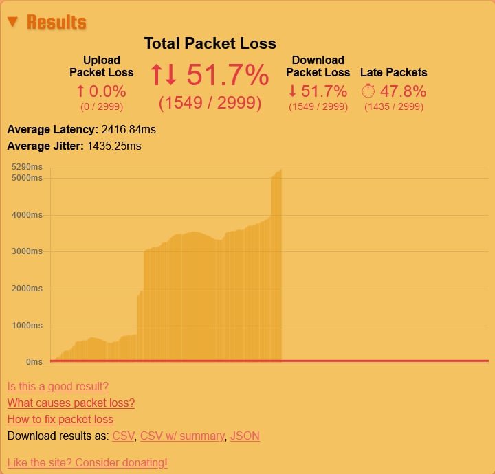 Ciao, ho una linea Fastweb FTTC (parzialmente su rete TIM, quindi BS-NGA). Da alcuni giorni ho notato una saturazione serale, osservabile con vistosi packet loss. Usando il sito https://it.packetlosstest.com/ ho eseguito alcuni test con preset "1080p game stream" e server "Germany". Allego un risultato: