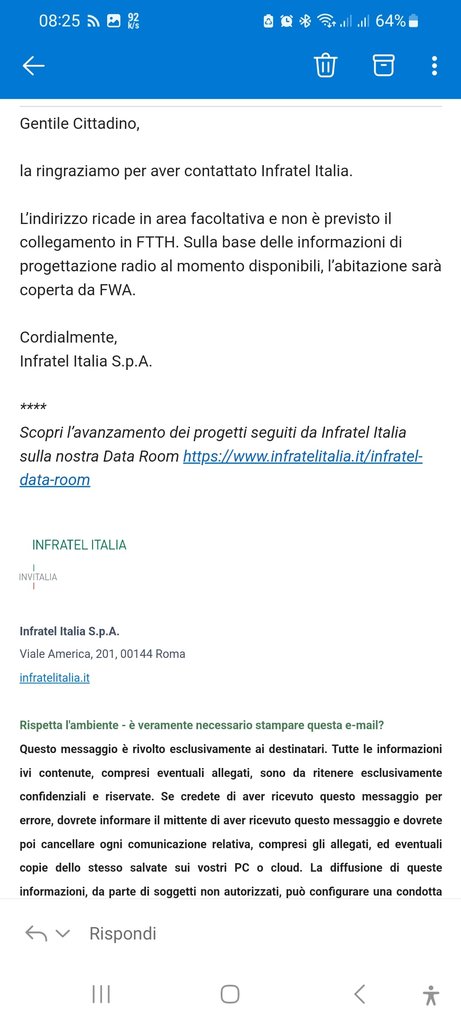 Infratel mi ha comunicato che il mio civico verrà connesso in fwa e provando a chiamare al ufficio tecnico in comune mi hanno detto che nemmeno loro riescono a parlare con infratel e che a loro basta e connettere il minimo di civico per essere apposto con i contratti per legge