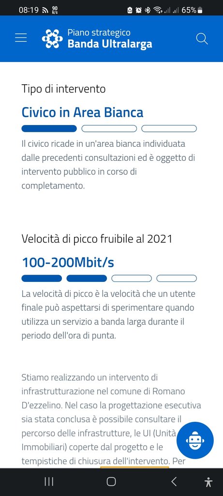 Come qualcuno di voi sono connesso in rete rigida alla centrale a 2,5km quindi in adsl 6 mega e per fortuna 3 anni fa ho tolto tutto e navigo con una SIM 4g e ora 5g in un router! Navigando su internet dal piano bul , verrà cablata la via principale e non la mia e la ftth arriva in un armadio fttc che ho a 50 metri da casa io abito dove c'è il punto nero gigante più o meno