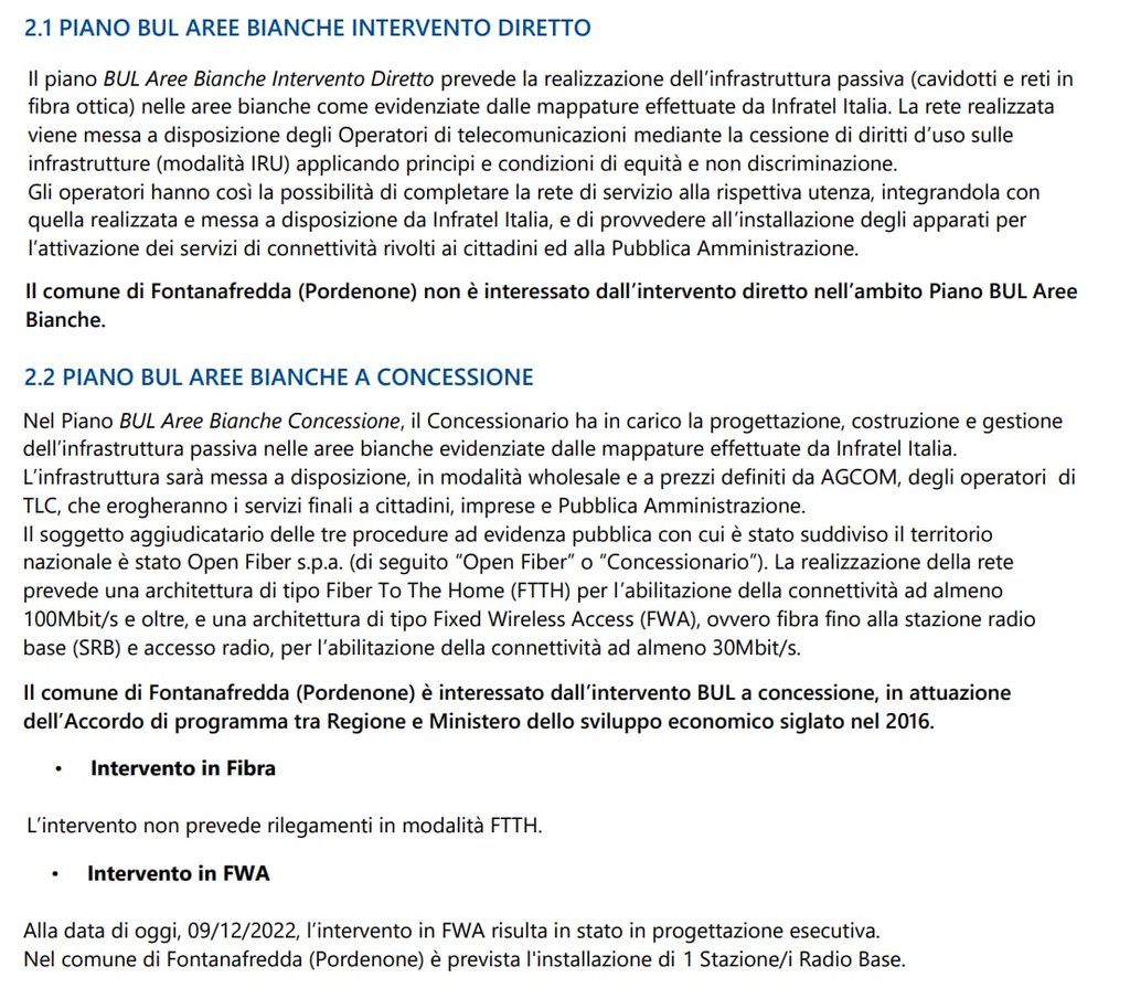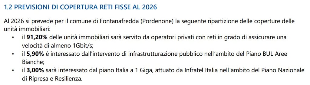 Il comune di Fontanafredda, verrà coperto entro il 2026 da Fibercop, con circa quasi tutti i civici (da Ronche a Vigonovo) con l'esclusione di una o due aree armadio.