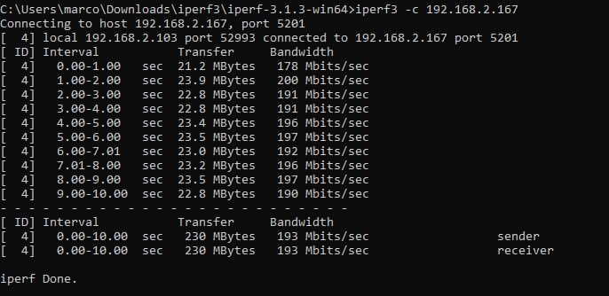 Il test tra i due notebook (2 client Wifi a 2 metri dall'AP, collegati alla massima velocità a 5Ghz) da questi risultati: