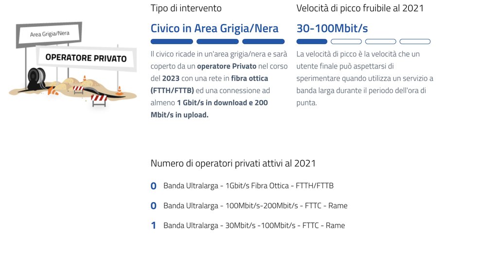 Attualmente io sono collegato con TIM e viaggio a circa 70 mega in download e 20 in up (fino a qualche mese fa era 93 ora 70 boh....) grazie alla FTTC. Dal sito bandaultralarga, se metto il mio indirizzo mi dice che sono in un'area grigia/nera e dal 2023 saro' coperto da un operatore privato con fibra ad almeno 1 giga e 200 mega in up.