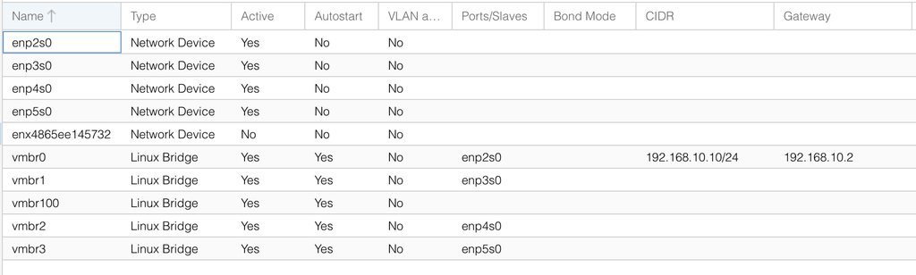 Situazione del nodo proxmox, con 4 NIC 2.5gbps in cui ho creato 5 bridges, vmbr0 collegato a eth0 con ip del nodo.