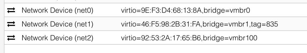 vmbr1 per eth1 collegato al ONT, vmbr100 come bridge tra OperWrt e Pfsense, vmbr2/3 sulle restanti porte per creare 2 LAN separate.