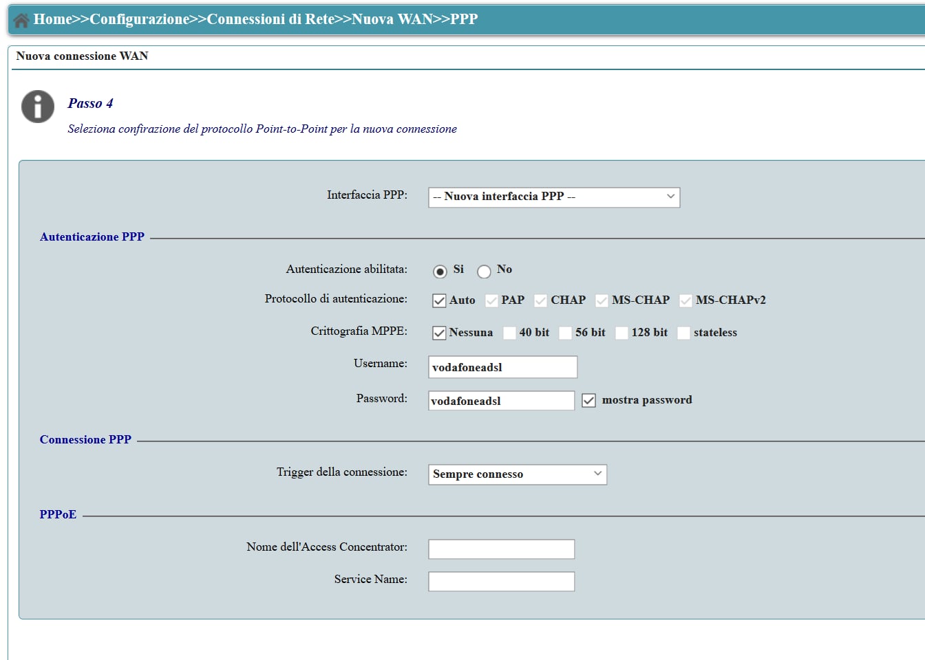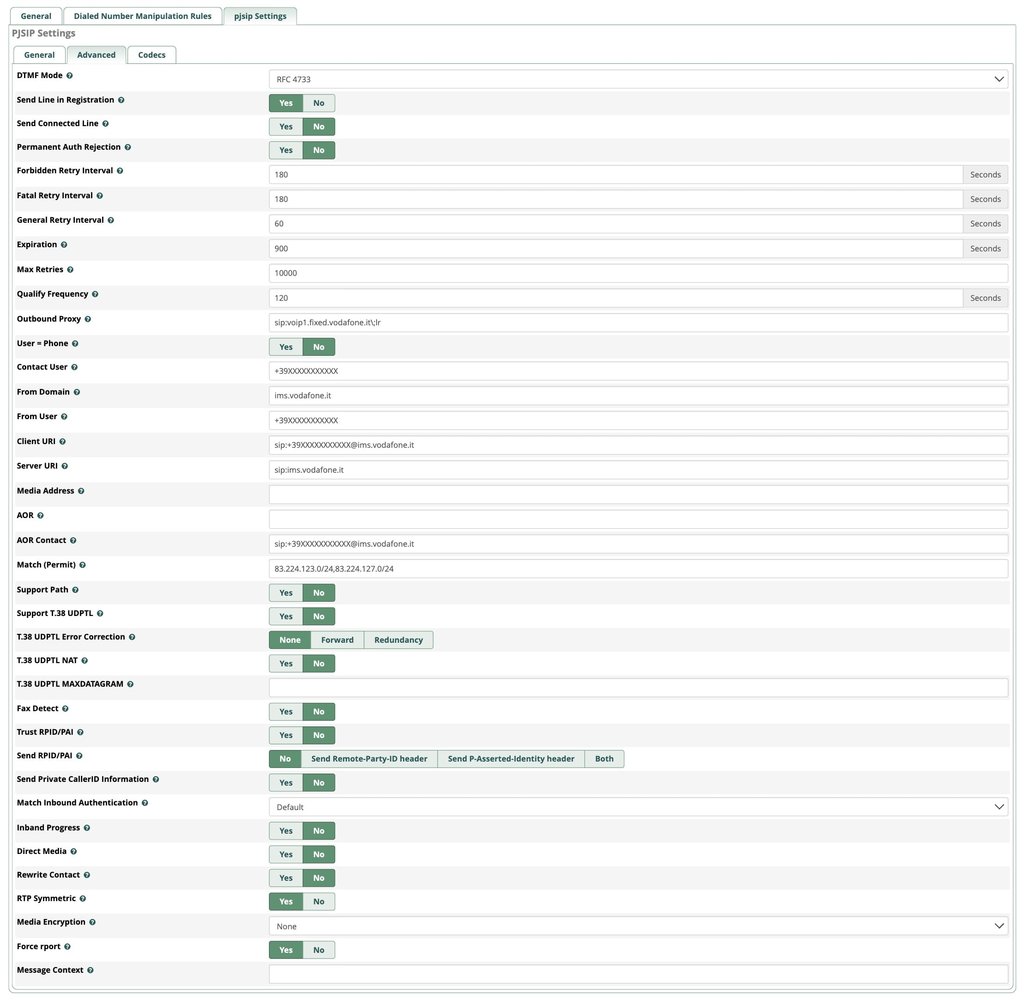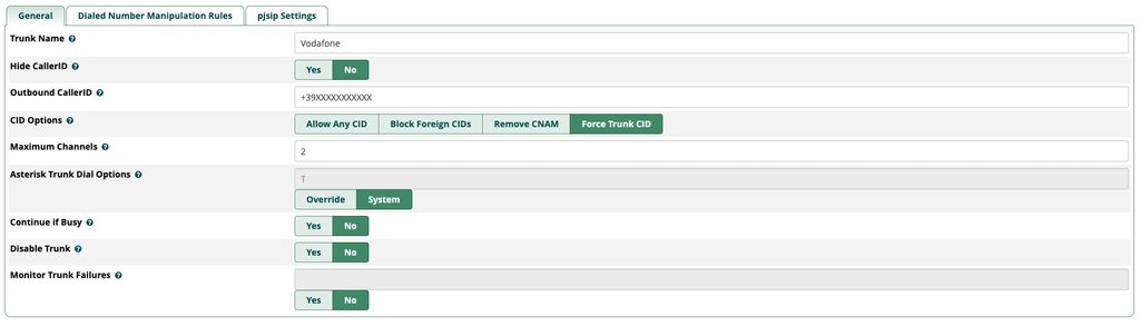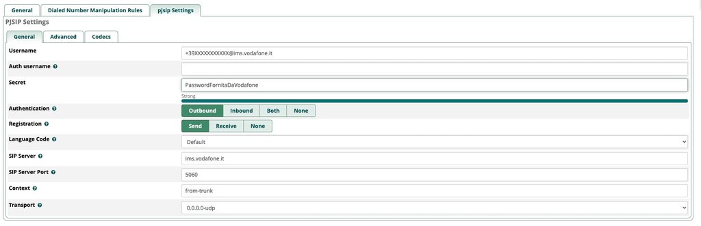 Per unificare le informazioni inserisco di seguito degli screenshot su come configurare il trunk con la linea vodafon (gentilmente presa in prestito dal blog, ora dismesso, di Pierluigi Grossi)