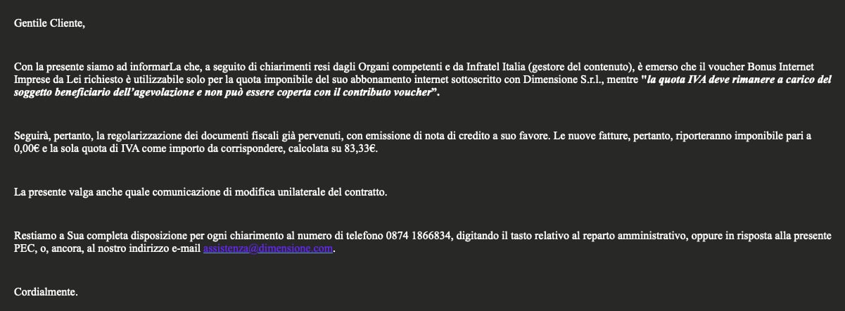 Belzebu69 Riporto qui che il voucher fibra non permette più all'operatore di pagare l'IVA al posto del cliente e per tanto i contratti di dimensione ora avranno l'iva da pagare a parte: