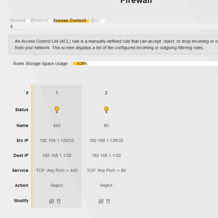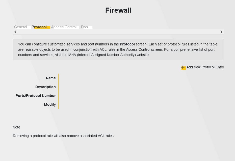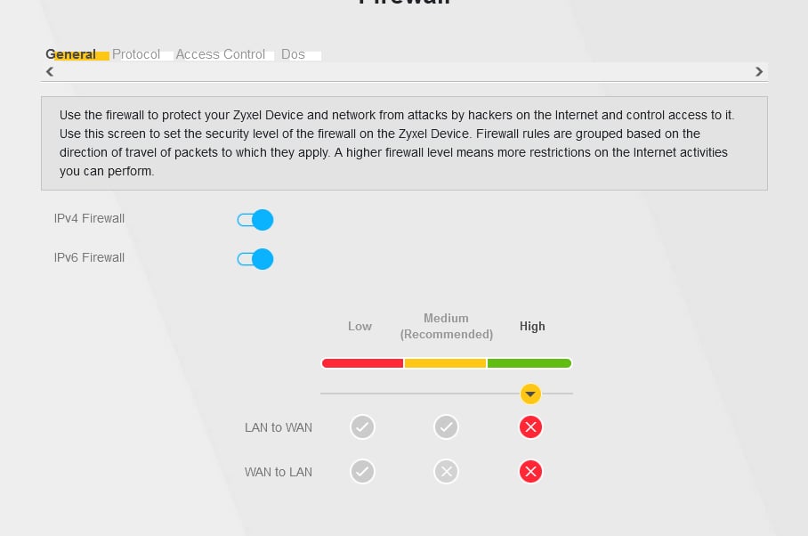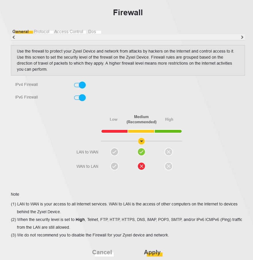 Modificando il livello del firewall mi pare che cambi la regola di default per il traffico, con Medium hai LAN che fa passare tutto e WAN che droppa tutto (salvo regole specifiche), mentre con High droppa tutto anche da LAN tranne specifici protocolli comuni. Nella scheramta Protocol puoi creare degli Alias per altri protocolli di rete che lo Zyxel non ha già identificati, poi li puoi riusare nelle regole.