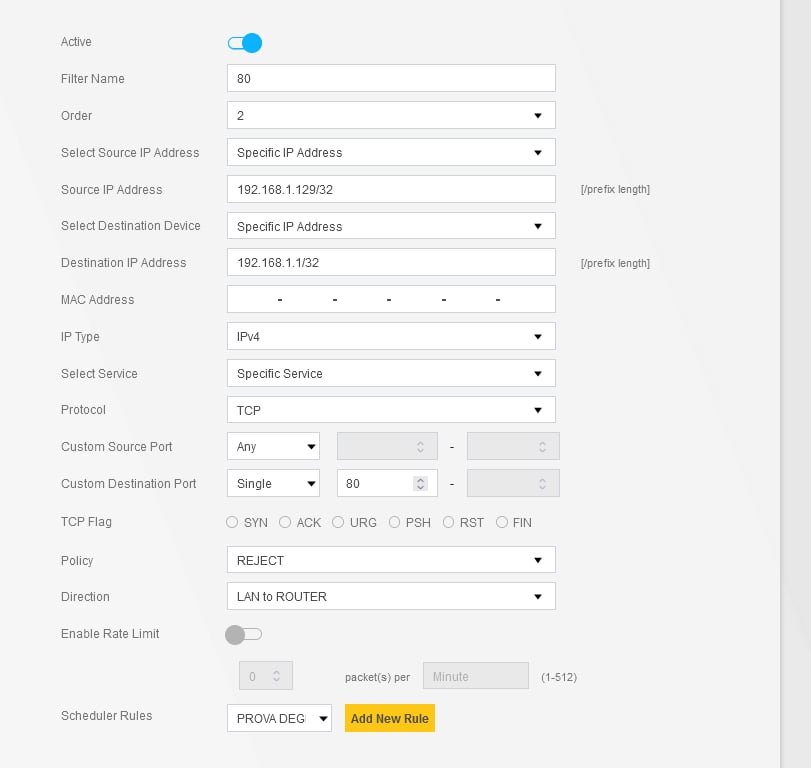 Le regole di firewal mi sembrano corrette, però c'è da capire come le interpreta lo Zyxel, specialmente "Direction" e che relazioni ha con gli indirizzi IP. Qui occore qualcuno che usa gli Zyxel, io putroppo non ne ho uno sottomano.