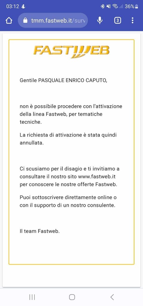 Buonasera, giorno 4 mi ha contattato l'assistenza di fastweb per il contratto che avevo richiesto il 27 dicembre dicendomi che gli era arrivato incompleto, lo stesso giorno lo hanno rifatto da 0 e da lì già mi era arrivato il contratto via email e il link per procedere con l'attivazione dei servizi, però noto che se chiamo il numero 146 dopo neanche un giorno dice che per problemi l'attivazione del contratto non è andata a buon fine, vi sembra normale? Il rispondiate automatico mi ha chiesto di inserire il numero per ricevere un SMS per procedere alla risoluzione ma esce questa schermata che allego, qualcuno mi può aiutare? Dalla pagina myfastpage però vedo tutto ok e che il servizio clienti sta verificando i miei dati
