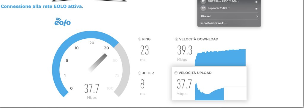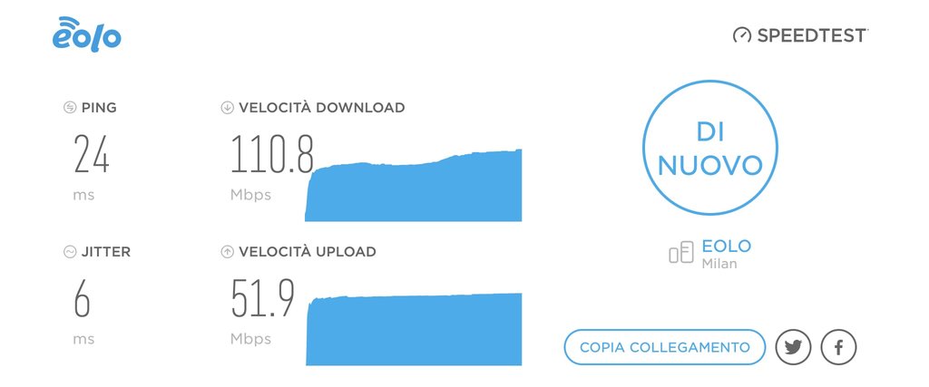 Questa sera, la situazione invece che migliorare è peggiorata, e addirittura in wifi (e anche in lan) ho risultati che si discostano nettamente da quelli che avevo in precedenza con la 100/20 (risultati pessimi raggiunti addirittura collegando il cavo diretto al "trasformatore" eolo):