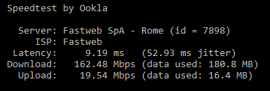 Ultimo test come sono collegato attualmente, presa all'ingresso di casa tolta (ex primaria) e collegamento della secondaria (ora unica presa di casa dove è collegato il Fastgate) con mammut elettrico e rimozione di 20m di filo che prima usavo per cercare di far erogare più potenza al Dslam, vista la bassa portante Adsl nonostante la vicinanza alla centrale.