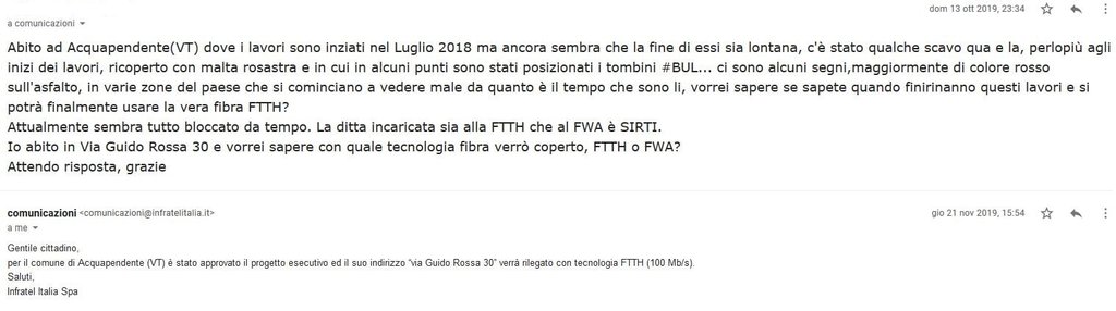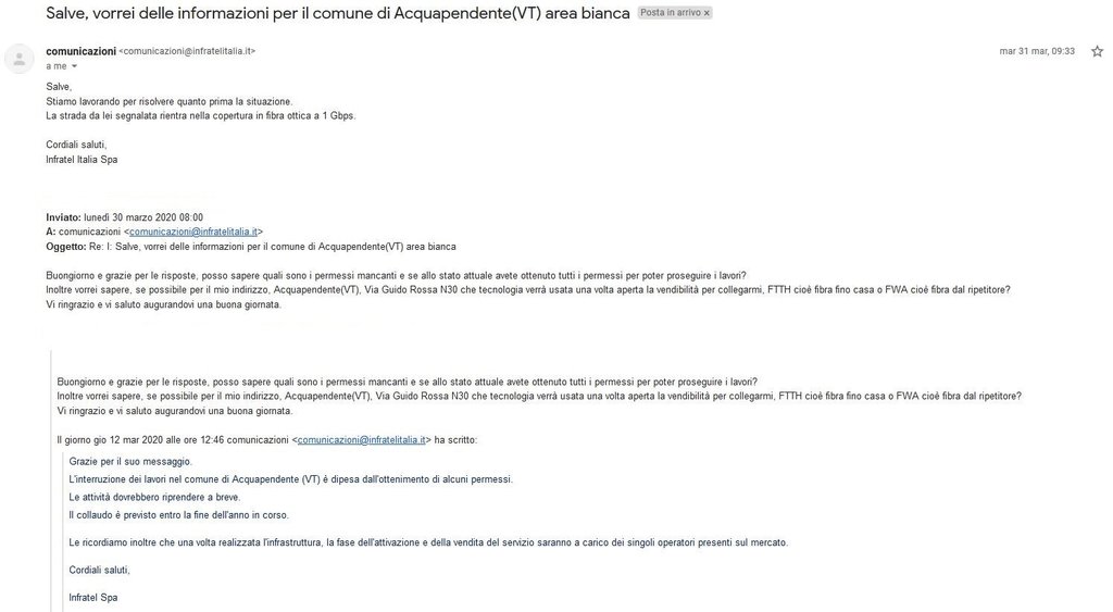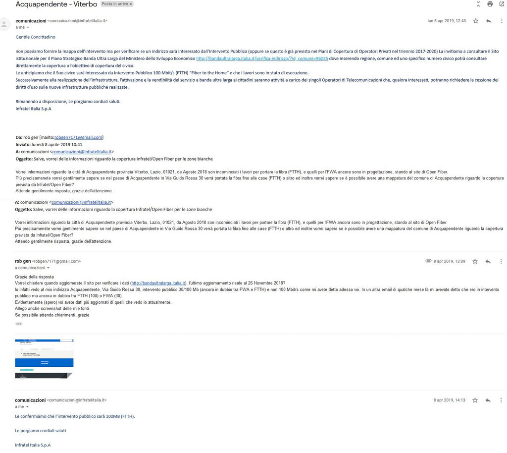 Cominciamo con una serie di e-mail mandate in risposta alle mie domande dalla casella elettronica uffciale di infratel comunicazioni@infratelitalia.it