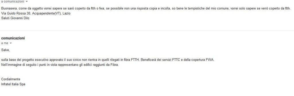 e qui cade il castello creato nel tempo, praticamente hanno dato informazioni non vere in tutte le varie mail e alla fine guardando la mappa per una manciata di metri hanno deciso per Fwa...non si parla di centinaia di metri...assurdo!