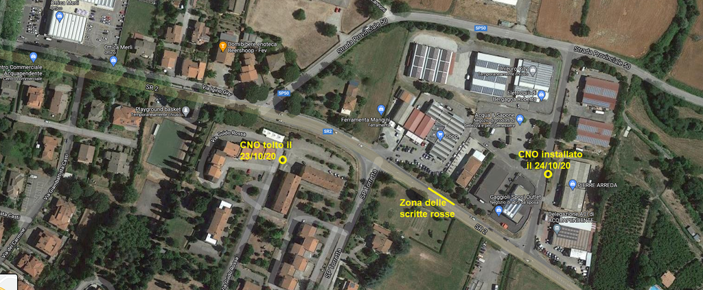 Ieri ho notato che è comparso un nuovo CNO in una zona non lontana da me, ho pensato quindi che alla fine abbiano semplicemente spostato il CNO che era nella mia via a questa zona vicina, se non fosse che nella Cassia qualche tempo fa (21/9/20) avevo visto queste scritte rosse...
