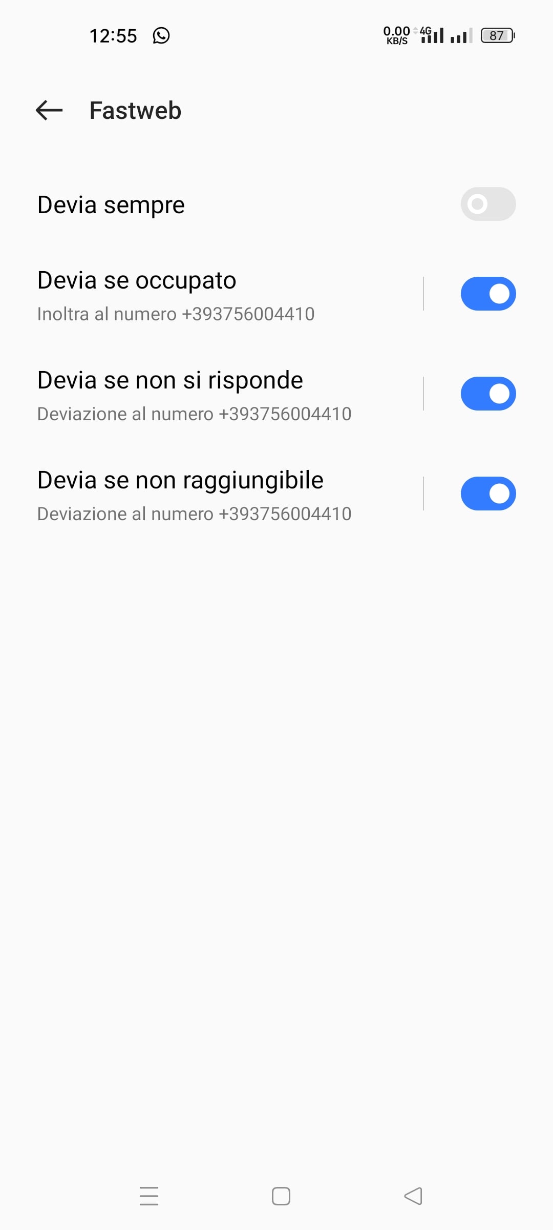 Ho però un problema: sembra che in VoLTE la segreteria rompa le scatole: se chiamo il mio cellulare Fastweb da un altro numero Fastweb e rifiuto la chiamata o non rispondo la segreteria non parte.