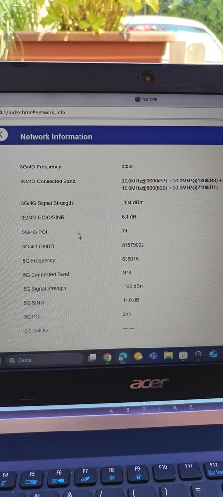 ovviamente senza fibra, navigo da circa 2 anni con HUAWEI 4G/LTE B618s-65d, cat 19, a circa 10-20 Mb.. vorrei migliorare il tutto, almeno un poco, con il 5G. da cellulare, con Samsung s20 e sim Voda vado a circa 200. spinto da questo ho sostituito il modem-router con Zyxel 5G NR serie NR7301/NR7302/NR7303, che mi ha fatto impazzire per le configurazioni, usandolo come router, un mare di tentativi, reset lunghissimi, senza mai ottenere nulla meglio di Huawei, le rare volte che riuscivo a farlo funzionare...(l'ho restituito!). poi ho tentato con 5G CPE 5s, H153, Router SIM 5G by Amaz, nessun miglioramento in 5g, sempre 10-15 Mb massimo, almeno semplice da configurare, ma senza risultati. Avrei deciso di per prendere un 889, o versione a pro, o qualsiasi cosa mi consigliate in un budget massimo di 400K... vorrei arrivare almeno a 100Mb, li sogno? perchè un semplice cellulare, anche vecchio, fa mooolto meglio? questa è la mia rabbia.. sono abbastanza scarso in settaggi, a stento mi configuro la mia rete interna, ho 3-4 switch con collegati vari access point wi-fi, per i vari piani e l'esterno. l'889a dovrebbe farmi da router, non vorrei incasinarmi con un secondo router, sottoreti etc, di cui nn sono esperto... Mi consigliate l'acquisto? leggo che in LTE comunque è cat.16, quindi comunque dovrebbe almeno assicurami le stesse performance del mio buon Huawai, ma a che prezzo??? scusatemi nuovamente se sono stato inopportuno o mi sono intrufolato in una sezione sbagliata o msg altrui...