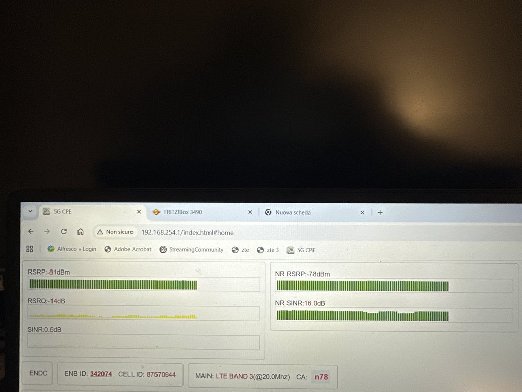 ho un ZTE MC889 fornito da WindTre FWA, collegato in modalità bridge al router TP-Link marchiato WindTre tramite un nuovo cavo CAT6. Il router è anch’esso in modalità bridge ed è collegato a una rete mesh TP-Link Deco BE25. Non ho modificato nessuna impostazione sull’MC889. Abito in campagna, senza ostacoli nelle vicinanze e senza vicini. Il mio problema è questo: a volte raggiungiamo circa 300 Mbps quando l’MC889 risulta connesso alla banda 5G n78. Tuttavia, nel giro di poche ore la velocità cala sempre — a 50 Mbps, talvolta anche 30 Mbps.