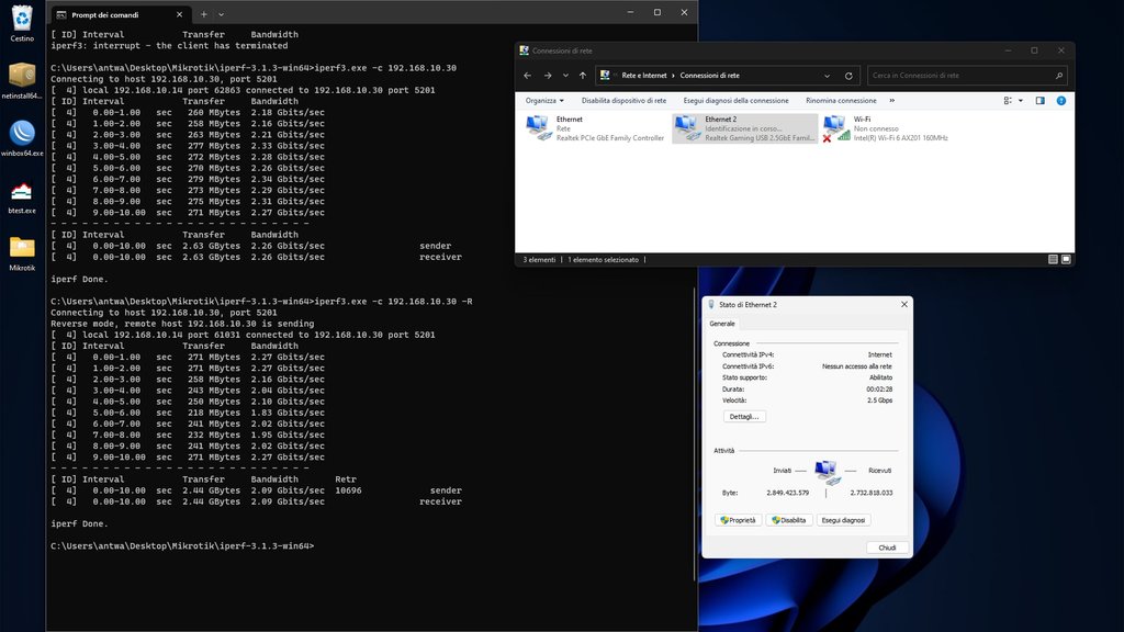 Giustamente dimenticavo, test fatto sulla rete della scheda USB 2,5Gbps con iperf al volo, nel caso qualcuno vuole vedere a quanto va la scheda (il server è il NAS di rete e ha scheda 10Gbps PCI Express)