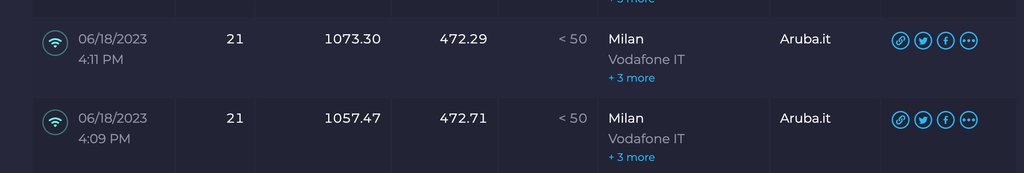 Vista la situazione è come avere un'adsl 20Mbps e andare a 256Kbps, quindi terminato il vincolo contrattuale dei 2 anni stacco e passo ad altro operatore, almeno che possa fornire assistenza via tickets o che risolva i problemi via telefono; ho provato di tutto ogni sorta di router o dispositivo perdendo tempo e denaro, niente da fare; la linea è stabile a 500/450 Mbps la sera scende a 250/200 Mbps ma con picchi fino a 800/450 Mbps.