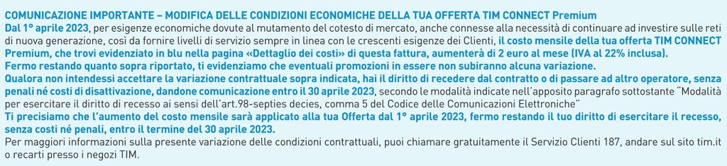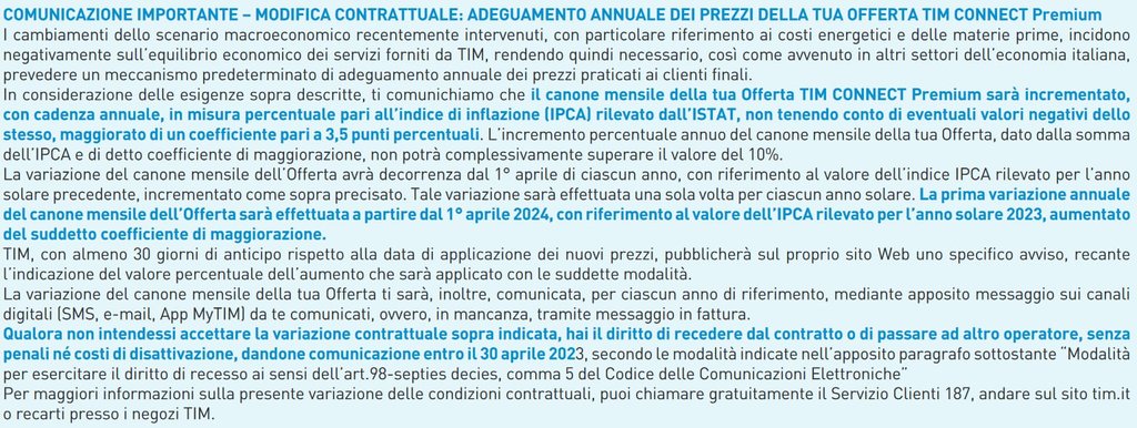 Oltre che alla nuova rimodulazione annuale causa inflazione, nell'ultima fattura della mia linea Tim Connect, offerta molto in voga fino a qualche tempo fa sul forum grazie al buon lorenzo e grazie al prezzo mensile davvero conveniente di 19.90 euro, è presente un paragrafo riguardante un'ulteriore rimodulazione, di 2 euro mensili, a partire dal rinnovo di Aprile.