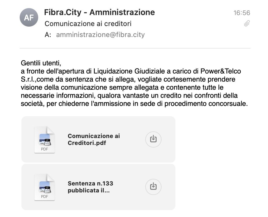Emy66 Fibra city è in liquidazione giudiziale. Tutti gli utenti che non hanno avuto i risarcimenti a seguito dell'interruzione del servizio, devono presentare l'istanza di inserimento al passivo.