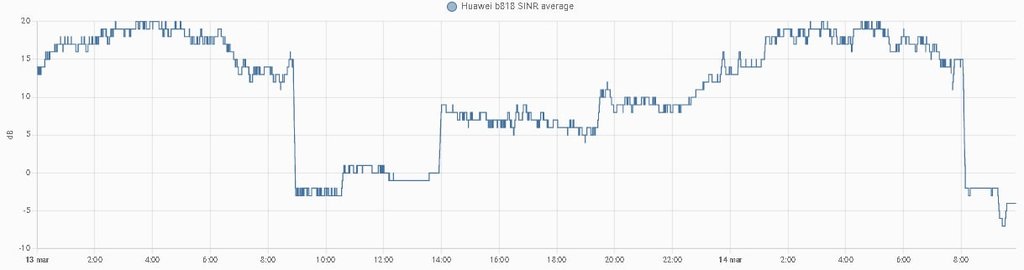 Ultimamente ho notato che il SINR si comporta in modo strano con dei cali improvvisi che ovviamente abbassano in modo drastico anche la velocità di connessione. Allo stesso modo di punto in bianco il SINR ritorna a valori molto buoni. Vi riporto il grafico dell'andamento: