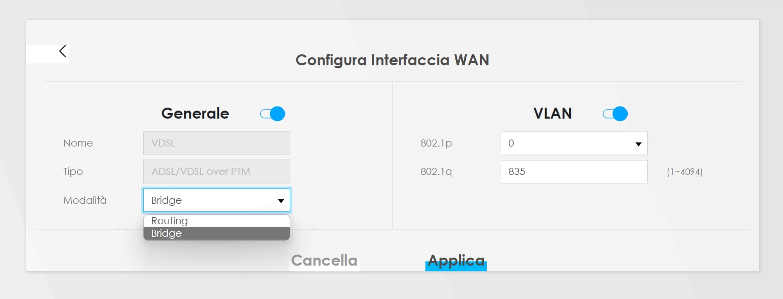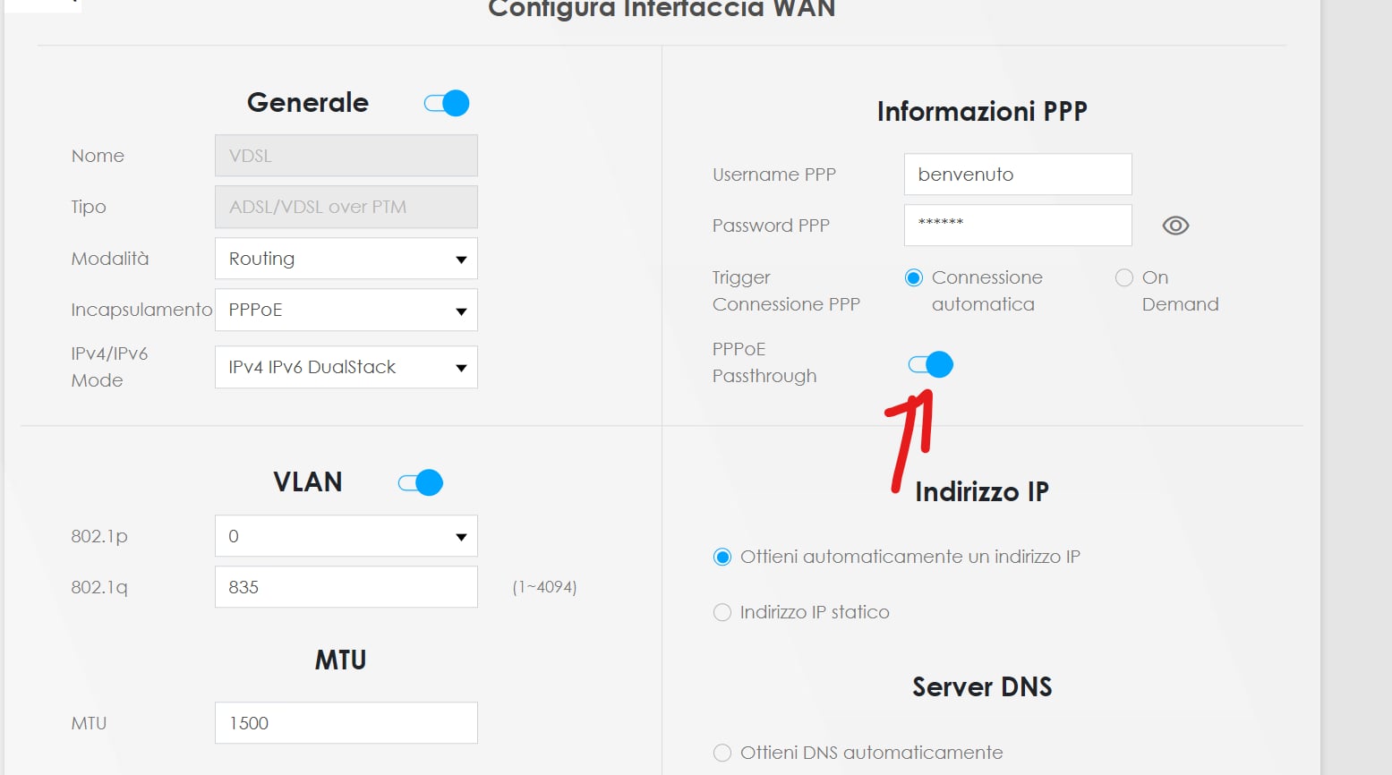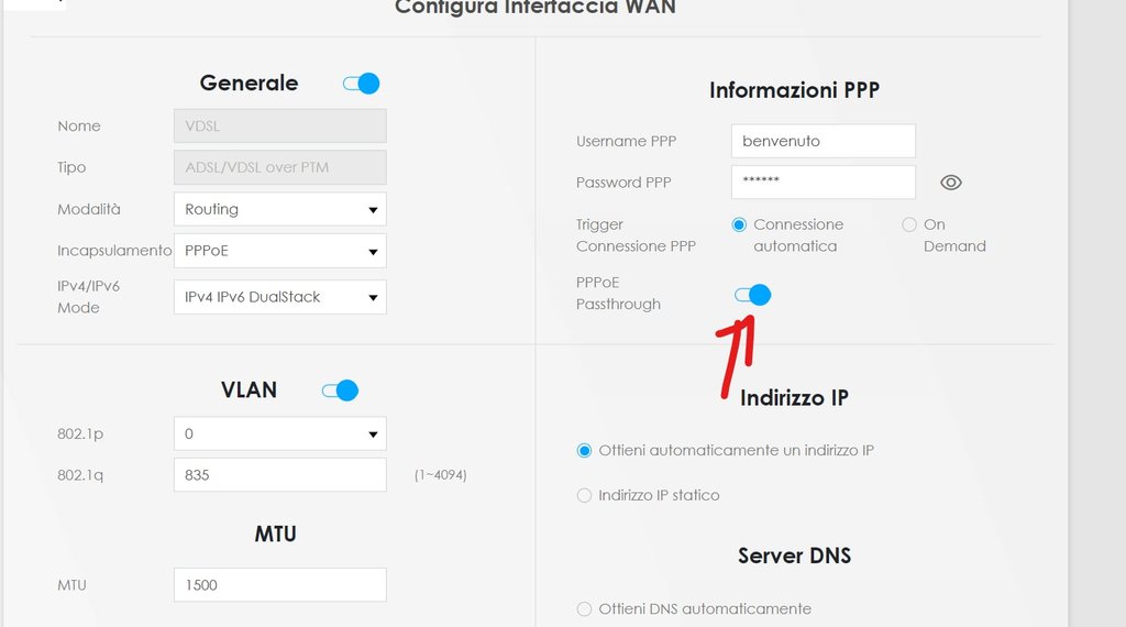 In entrambi i casi poi sul mikrotik dovrai configurare la PPPoE con delle credenziali generiche. Se segui le mie istruzioni non devi configurare la VLAN. Ricorda che PPPoE passthrough potrebbe non funzionare sulla tua linea (in quel caso ti resta solo l'opzione bridge).