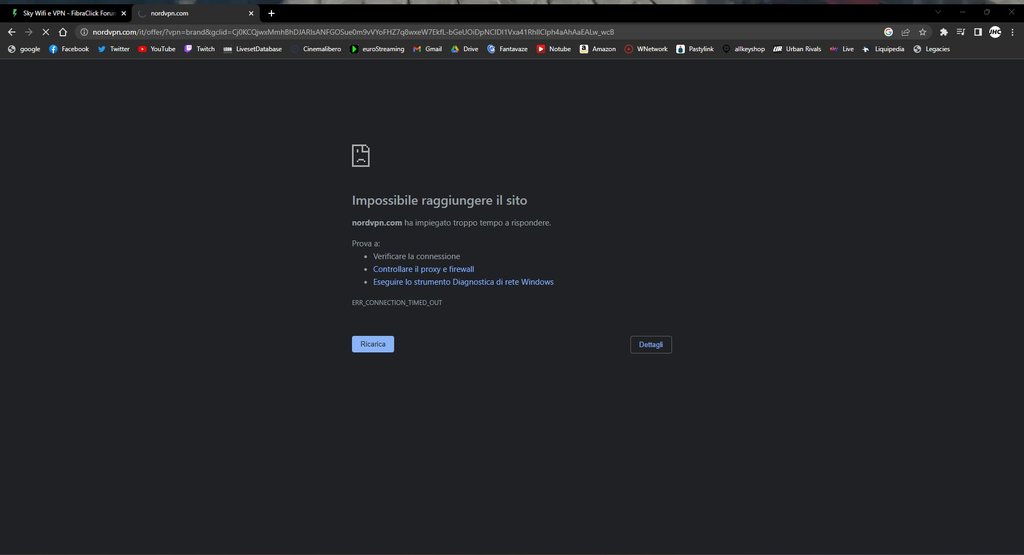 flavione giusei Sembra un blocco del router quindi. Secondo me, hai qualche impostazione di sicurezza attiva. Sky Wifi abilita di default una specie di filtro, una sorta di rete sicura di cui non ricordo il none preciso ma che si può disabilitare dall'app. Quando l'ho avuta io la scorsa estate mi ricordo che c'era una specifica impostazione. Se fanno come in UK, potrebbe essere attivo di default un filtro familiare lato Sky (non sul router), che funziona con DNS hijacking (quindi cambiando DNS non si risolve), e che non e' compatibile con le VPN. Va disattivato, magari chiamando il servizio clienti se non si trova come fare via app.
