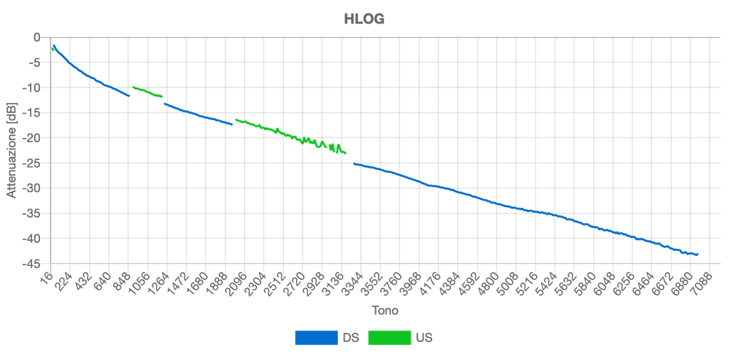 maverick464 Buongiorno, sono nuovo nel forum, ho letto la guida su come interpretare il grafico HLog ma ammetto di non averci capito granché; vi posto quindi i miei grafici per un'analisi sulla mia situazione. Premetto che: faccio parte di un condominio orizzontale di 7 unità di nuova costruzione, io ed il vicino abbiamo attivato TIM un anno fa in ADSL (17/1 Mbps), ad aprile sono passato a FTTC ed avevo 104/20 Mbps, da un mesetto sono sceso a 83/20 Mbps. forse diafonia, visto che anche il vicino ha chiesto l'upgrade a FTTC? ho delle derivazioni? c'è modo di aumentare nuovamente il download? s chiedessi a TIM di cambiarmi profilo in 35b, vedrei dei miglioramenti? è uno switch gratuito o a pagamento? Grazie mille