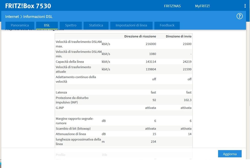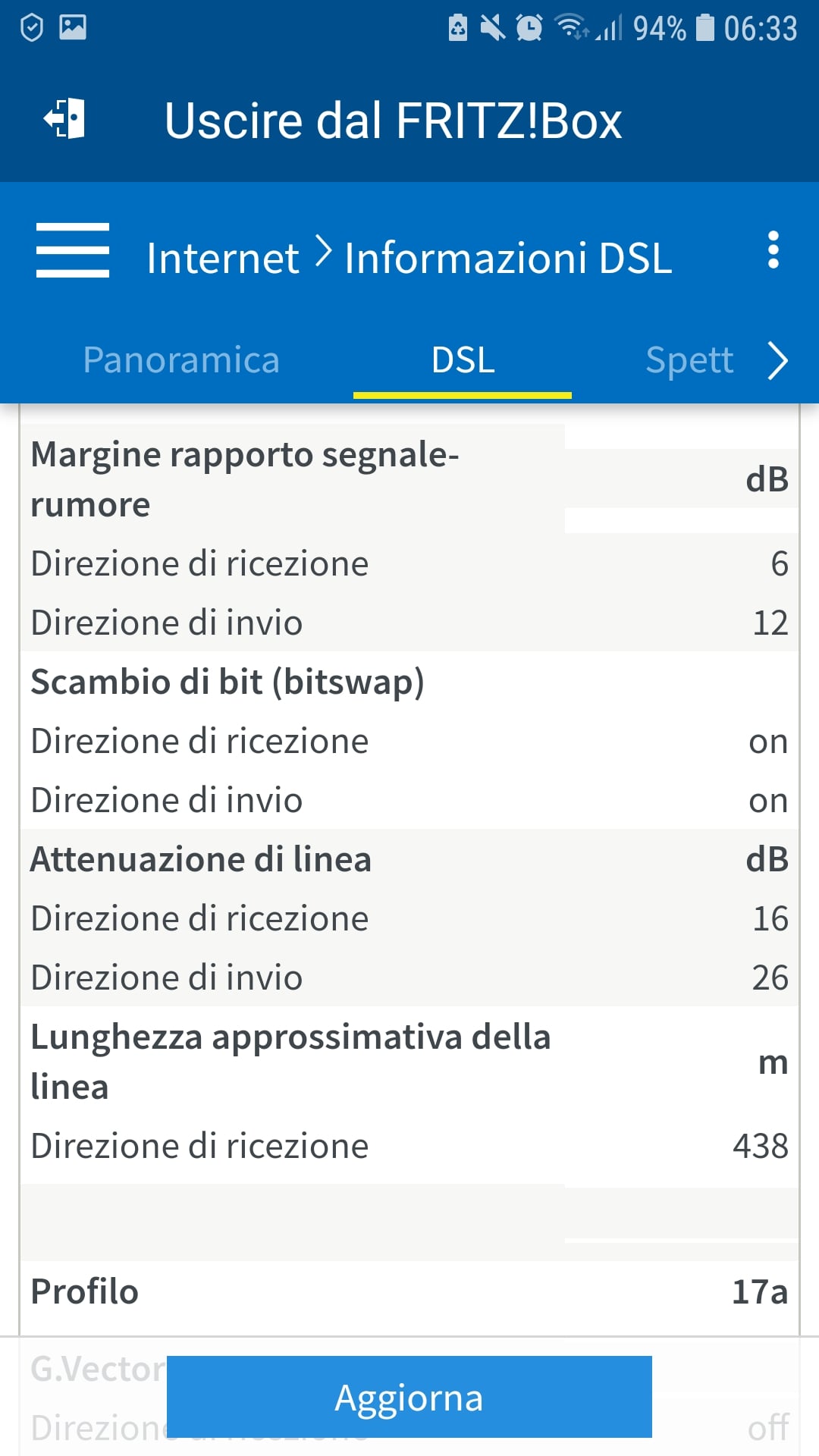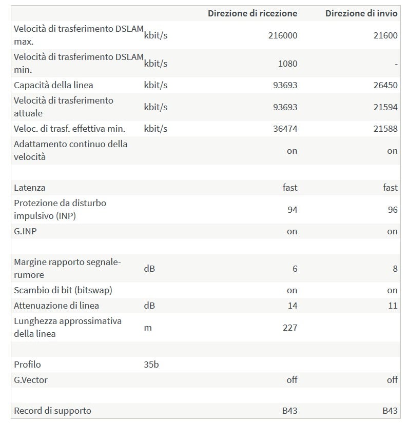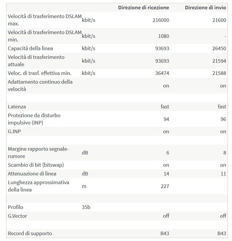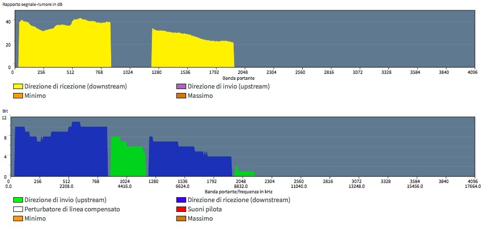 bergamo1907 Linea buona, nessuna derivata diafonia media sulle frequenza del 17a, bassa sul 35b. La tua velocità potrà scendere a mano a mano che i vicini chiederanno il passaggio dalla 100 alla 200. Non riavviare troppe volte il modem, ti hanno già messo profilo SOS, chiedi al 187 tasto 2 che ti mettano il profilo i2012_1008 (lo fanno lì per lì, non far aprire segnalazioni, se non è capace saluta e richiama)