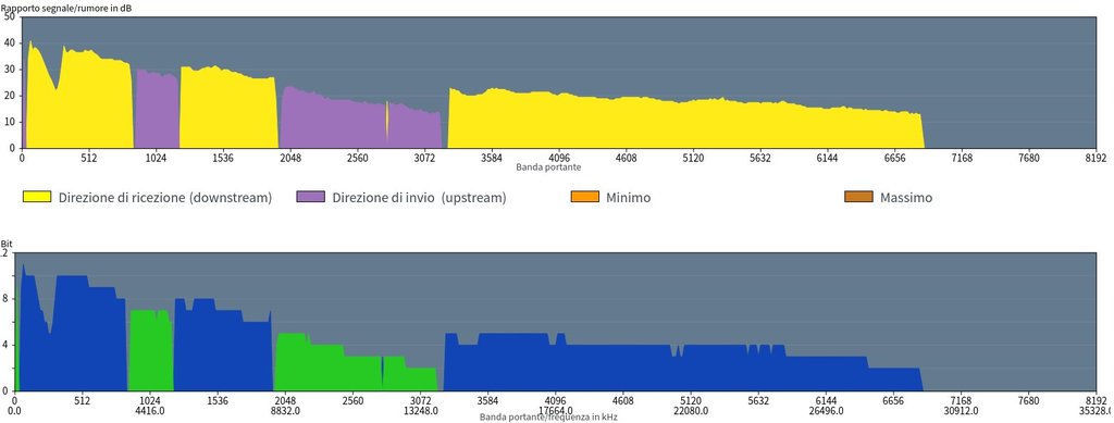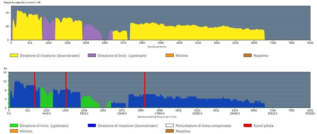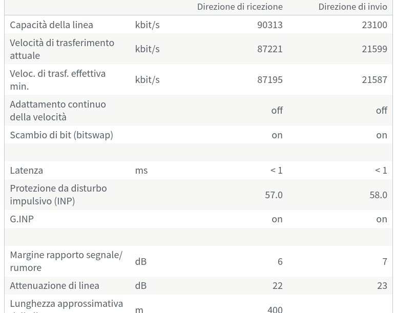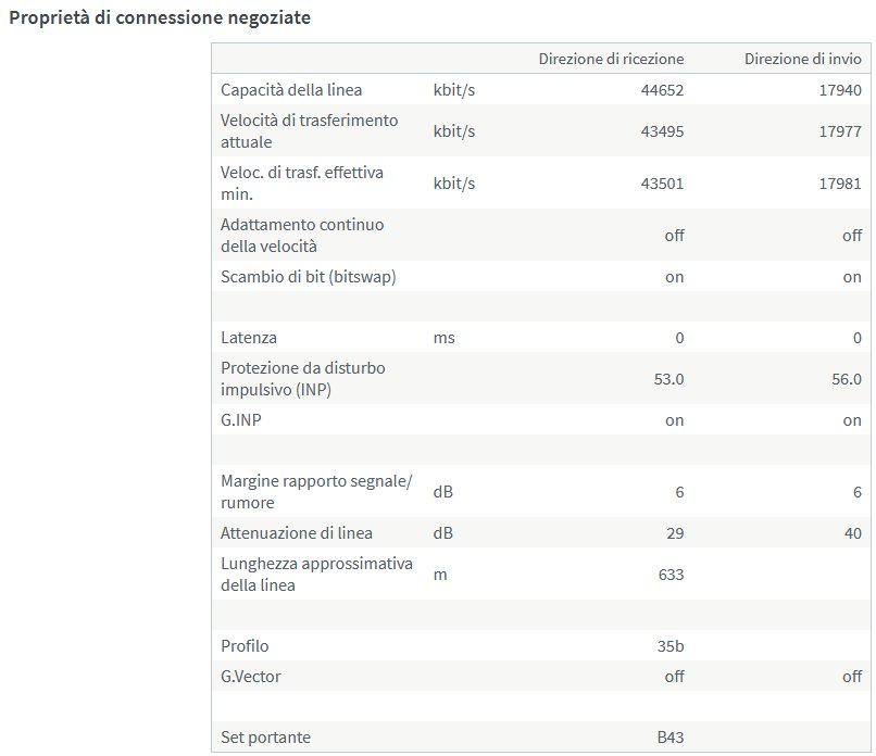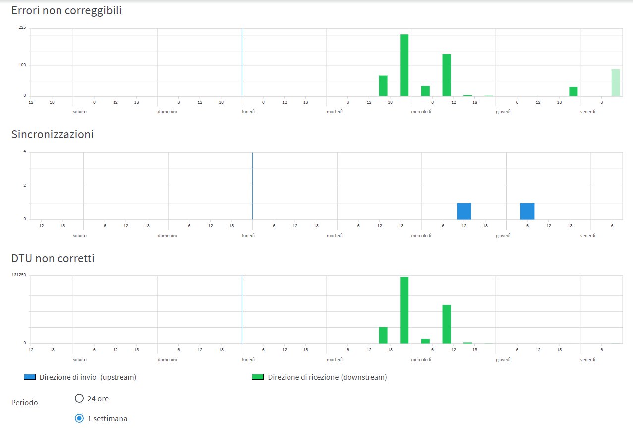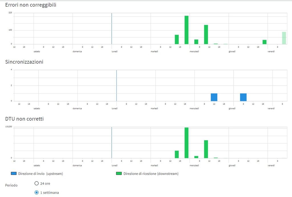 Ecco le statistiche dell'ultima settimana, le sincronizzazioni sono dovute al fatto che ho staccato il cavo per fare delle prove con un altro router, quello di Poste, che aggancia anche 20 mega in meno. Adesso il Fritz vede una linea lunga circa 450 metri, la portante varia tra i 90 ed 100 mega, dipende dai momenti. I 130 mila DTU non corretti si sono verificati quando non c'era nessuno in casa. Credo proprio che ci sia qualche problema o nella chiostrina oppure nell'armadio di zona.