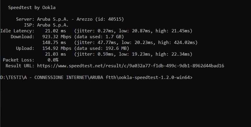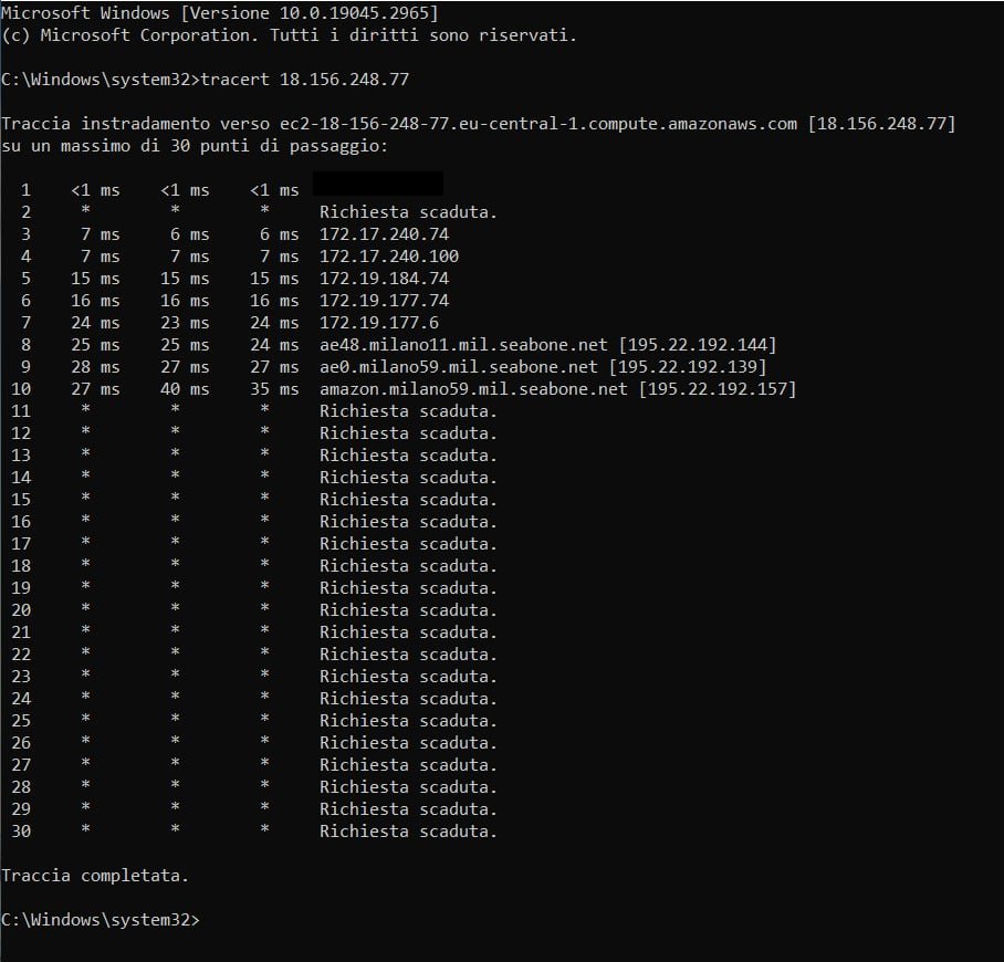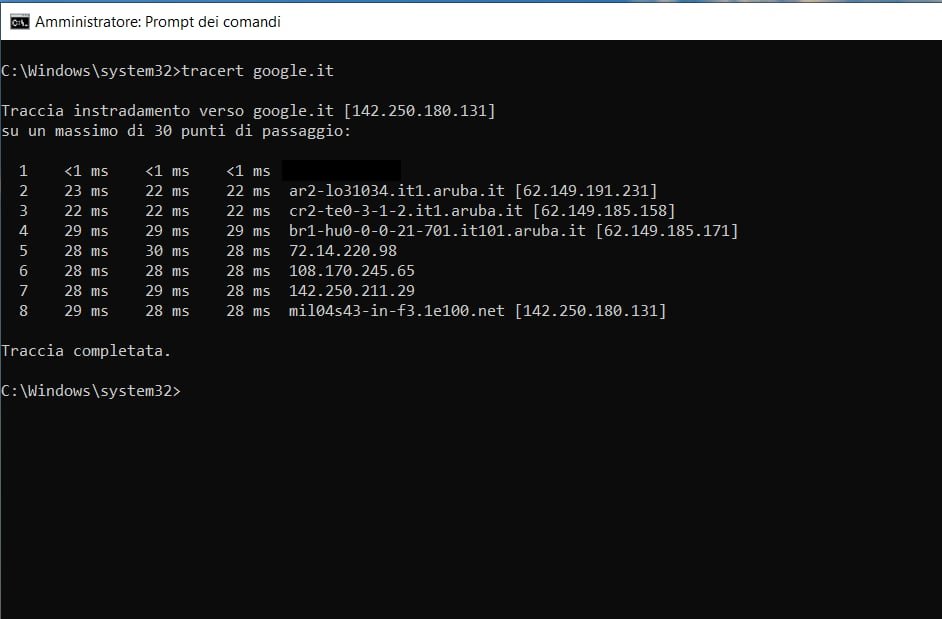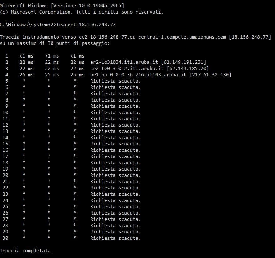 Tracert verso un server fatto stamattina con linea FTTH Aruba