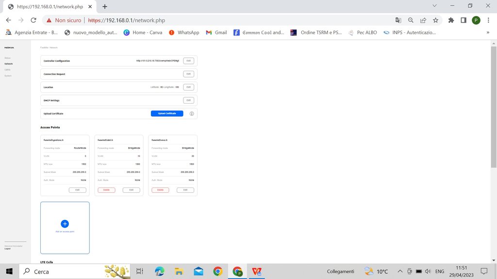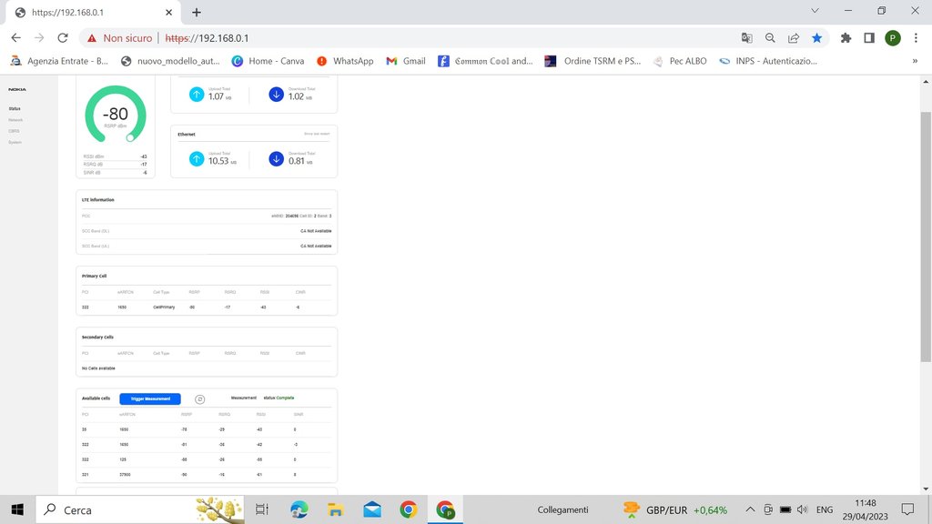 Arrivo al dunque: giovedi' 27 Aprile 2023 il tecnico mi ha installato a tetto il Router FastMile 4G05-A della Nokia di cui sembrano esserci ottime recensioni e il modem ZYXEL. Al termine dell' installazione con un segnale buono, lo speed test da 84Mbs, dopo alcune ore il segnale sparisce. Provo ad accedere all'interfaccia della FastMile ed ecco cosa mi sono ritrovato: