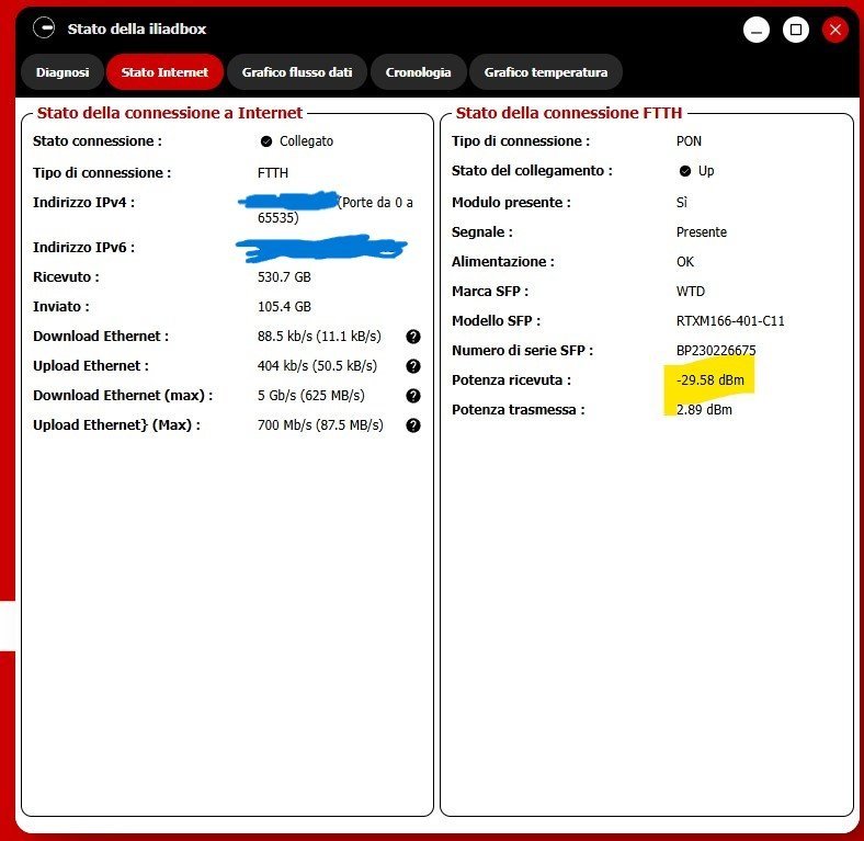 Il risultato? Ad oggi la situazione è la medesima, non essendosi mai abbassato il valore dell'attenuazione ottica che attualmente ammonta a ben -29.58 dBm (vi allego foto), sto continuando a subire disconnessioni, ricominciate oggi, ho contattato un paio di ore fa l'assistenza sperando che questa volta non ignorino il problema.