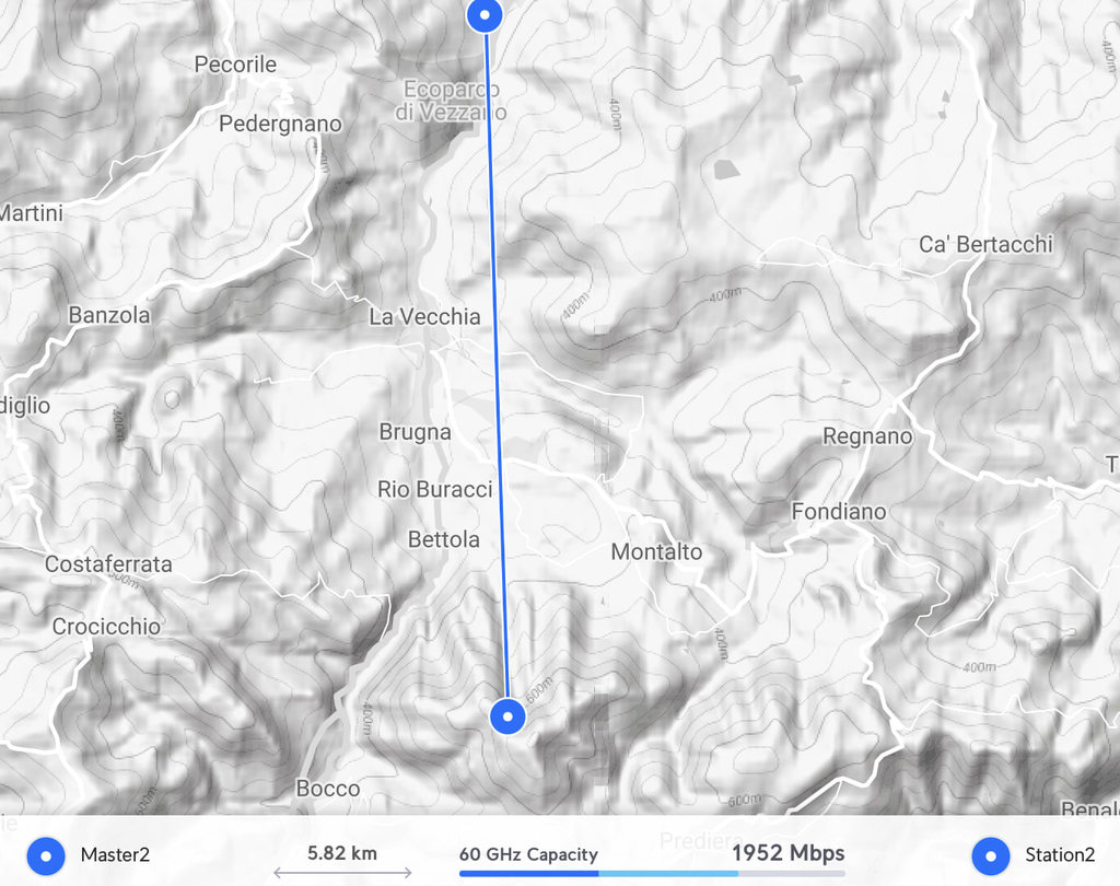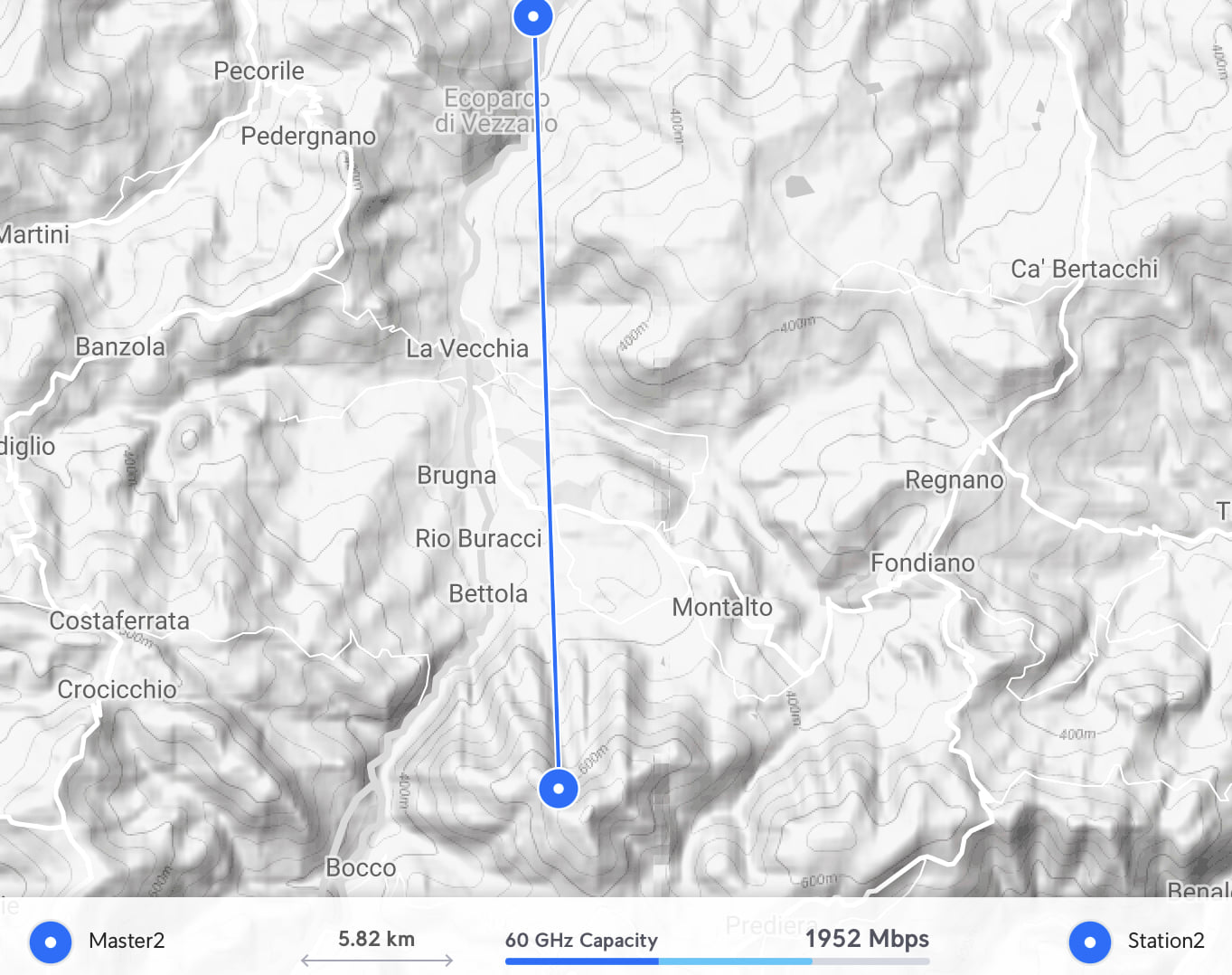 ochoalmocho Buongiorno, con il tool di ubiquiti dovrei (in teoria) avere visuale verso una BTS Eolo 200. La distanza è di quasi 6km, 5,8 per l’esattezza. Se faccio una verifica di copertura nel sito di Eolo mi propone una 30, che ho già avuto in passato, ma tramite una diversa BTS a 1,8 km (in altra direzione) che vedo dalla finestra. L’ideale quindi sarebbe - se fattibile - collegarsi alla BTS più lontana. Quali sono le distanze limite per avere 100 o 200 Mbit? Taggo @kaia