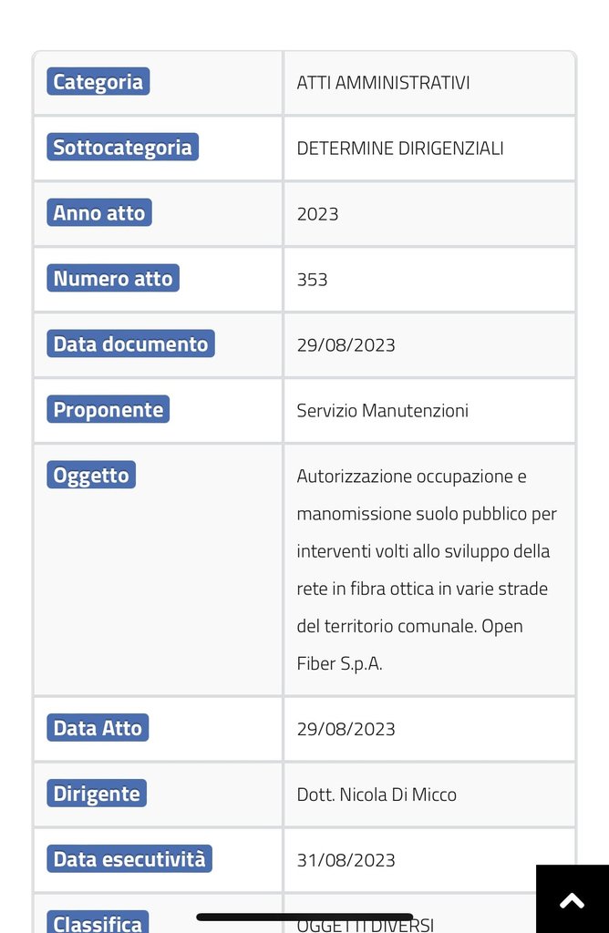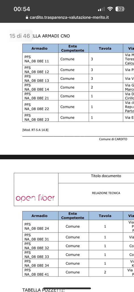 Praticamente nell’allegato A hanno messo un foglio di 46 pagine dove viene illustrato TUTTO il piano come si svolgerà in città e le vie coinvolte con info di scavi e armadi fatto proprio da OpenFiber stessa, fortunatamente la mia via risulta. Poi come potete leggere c’è scritto che hanno autorizzato la ditta a manomettere il suolo pubblico, quindi quello che mi chiedo, nelle prossime settimane posso finalmente aspettarmi qualcosa? Perché é da tempo che hanno smesso senza capire perché, se qualcuno vuole leggere andate sull’albo pretorio della città.