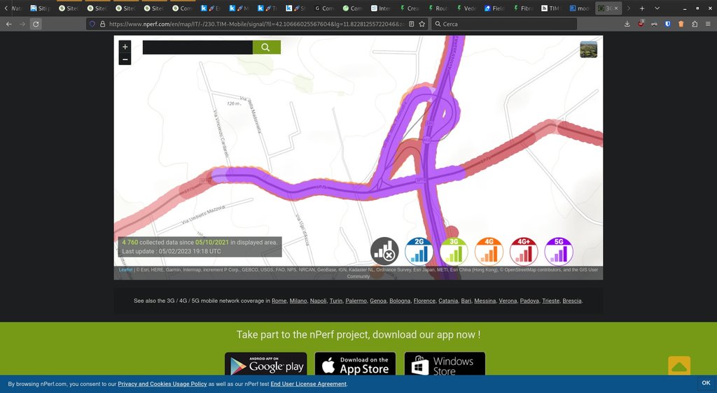 All'interno della casa ho fatto delle prove con un Tp-link Cat.6 portatile con sim Tim, Fastweb, iliad con velocità di download scarsine intorno ai 7/8 mb, mentre all'esterno rivolgendomi in direzione della prima BTS (quella a 800mt) le velocità si alzano fino a picchi di 67mb con fastweb e con tim a seguire vicina.