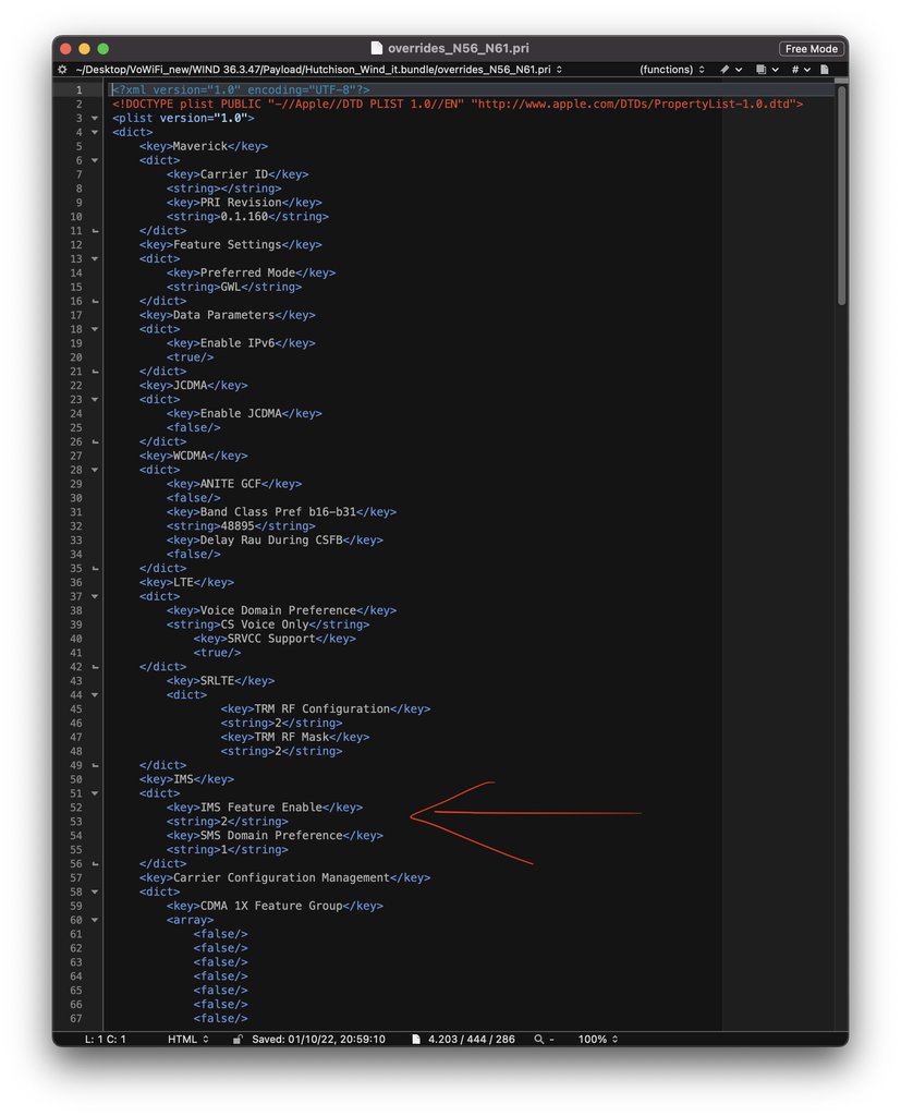 Poi, facendo la stessa cosa su un iPhone 6 (iOS 12), dove i file .pri non sono criptati, ho avuto la conferma: c’è un campo per abilitare IMS voce/sms/entrambi. Più tardi riguardo e ti metto lo screenshot.