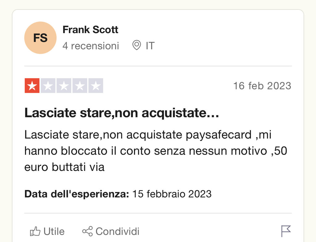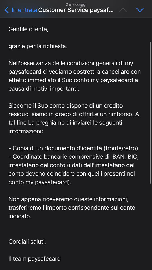 Salve, avevo un conto paysafecard che utilizzavo raramente, aperto qualche anno fa, circa una decina di giorni fa me ne ricordo, e vado a comprare un pin da 10€ per caricarlo sull’account e riutilizzarlo, e all’improvviso mi bloccano il conto senza un motivo. Mi chiedono in varie mail da dove effettuo l’accesso, su che dispositivo e che connessione (😳) rispondo e poco fa mi rispondono con questa mail:
