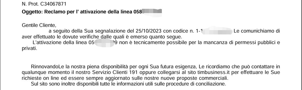 Ti informiamo che, le tue precedenti richieste di conversione della linea in oggetto in tecnologia Fibra FTTH, sono state annullate per mancanza permessi di terzi.