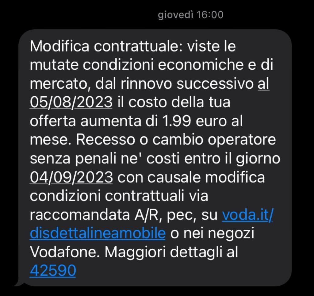 visto che rimodulare del oltre 35% per per mutate condizioni di mercato mi sembra illogico (diverso forse un +10-15%) volevo assolutamente scappare da Vodafone che come noto non ha cambiato il vizio, ci ero rientrato da poco più di 1 anno dopo aver appreso che avessero smesso di rimodulare, beh, non è così...