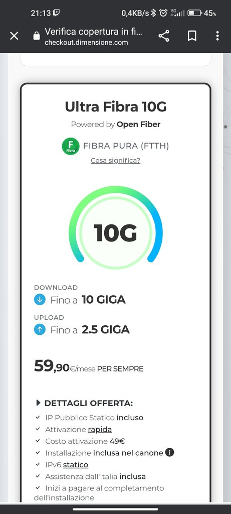 giusgius giuse56 Verifica sul nostro sito la copertura, se ti propone 10Gbps è coperto. Il tuo indirizzo è coperto (mi ricordo chi sei 😃)