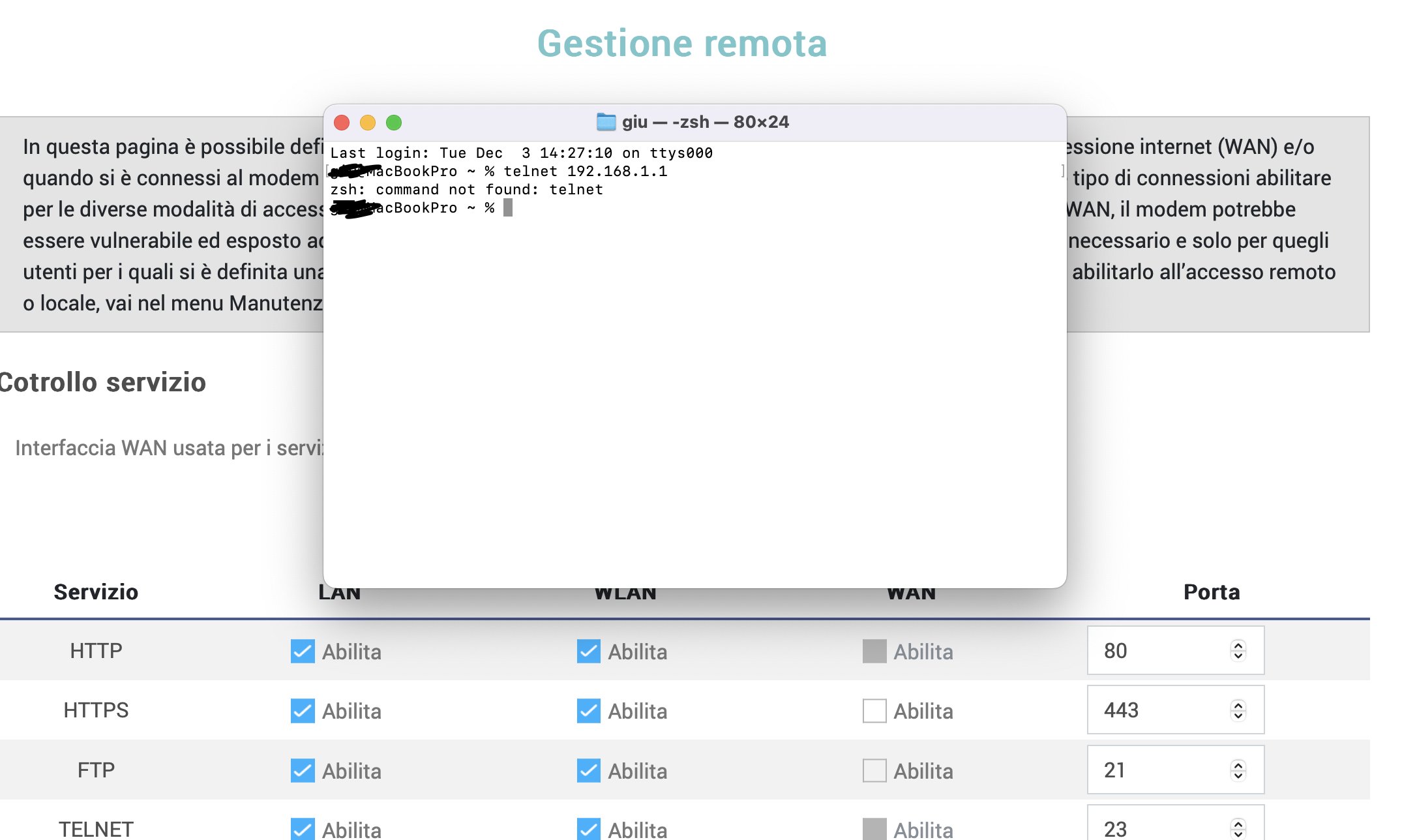 pgxx abilitare prima telnet nella tab "gestione remota" del modem, poi in un terminale ci scrivi telnet 192.168.1.1 e fai l'accesso con username e password della GUI del modem.